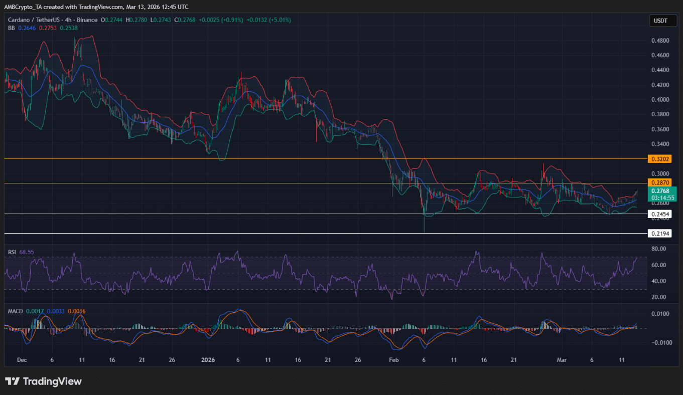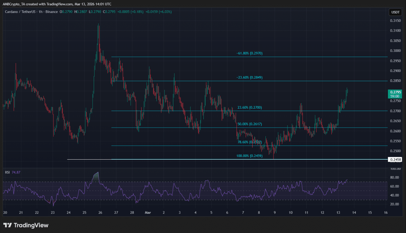 Giá Cardano (ADA) đang được giao dịch quanh 0,270 USD tại thời điểm viết bài, sau khi bật tăng từ vùng hỗ trợ 0,254–0,260 USD – khu vực tiếp tục hấp thụ hiệu quả áp lực bán còn sót lại sau cú giảm mạnh hồi tháng 2.