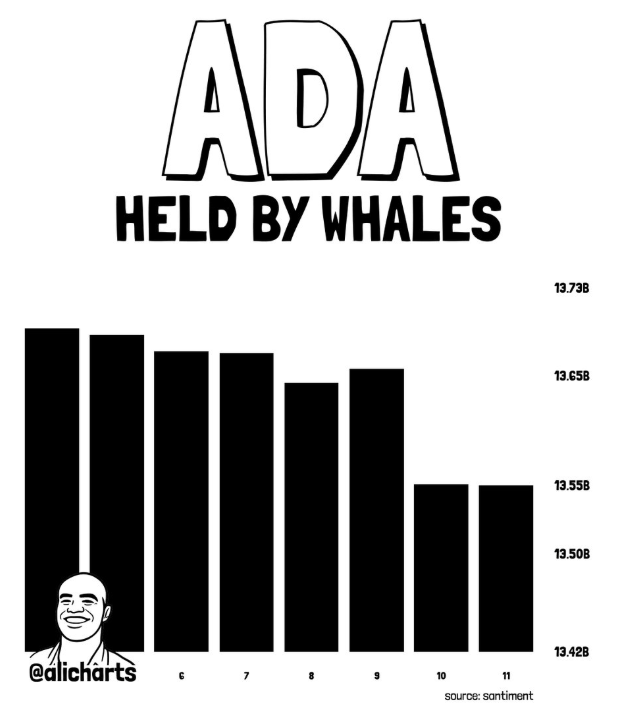 Dữ liệu từ Santiment cho thấy các ví lớn nắm giữ trên 1 triệu ADA đã giảm lượng nắm giữ từ 13,73 tỷ xuống còn khoảng 13,42 tỷ ADA. Như vậy, khoảng 130 triệu ADA đã được rút khỏi nhóm ví này chỉ trong một tuần, diễn ra ngay sau giai đoạn tích lũy mạnh khoảng 454 triệu ADA trong đợt phục hồi của tháng 2 từ vùng 0,219 USD.