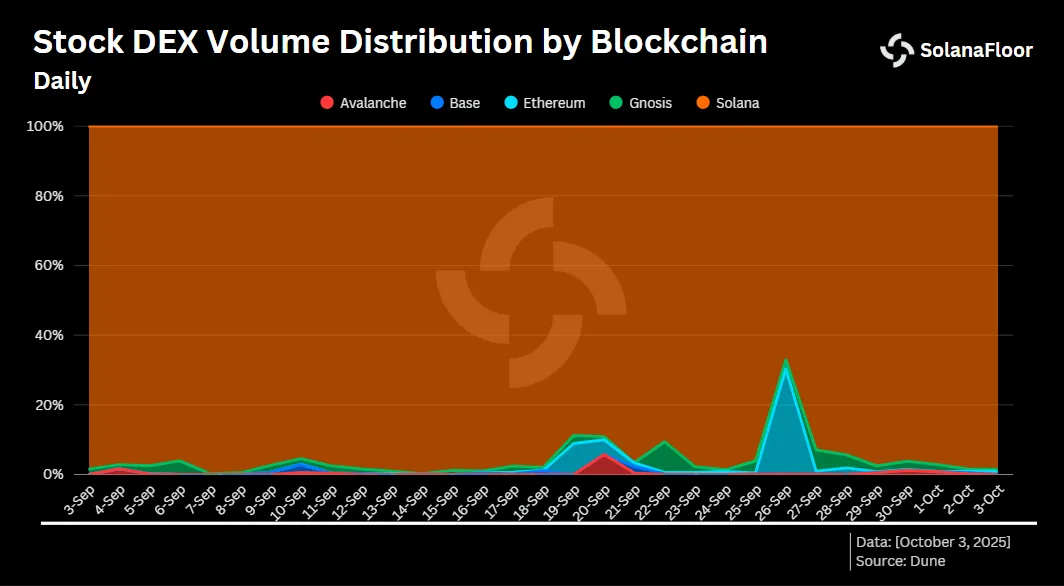 Một thành tích nổi bật cho thấy vị thế áp đảo của Solana: mạng lưới này hiện dẫn đầu toàn thị trường trong lĩnh vực giao dịch cổ phiếu token hóa. Trong 30 ngày gần nhất, Solana chiếm hơn 95,6% tổng khối lượng giao dịch trên các sàn DEX, bỏ xa Gnosis với 1,98% và Ethereum với 1,83%. Điểm ngoại lệ duy nhất là ngày 26/9, khi thị phần của Ethereum bất ngờ tăng vọt lên hơn 30%, song Solana vẫn vững vàng ở mức 67%. Ngoài ngày này, Solana đều duy trì thị phần ổn định trên 89%, khẳng định rõ ưu thế vượt trội của mình.