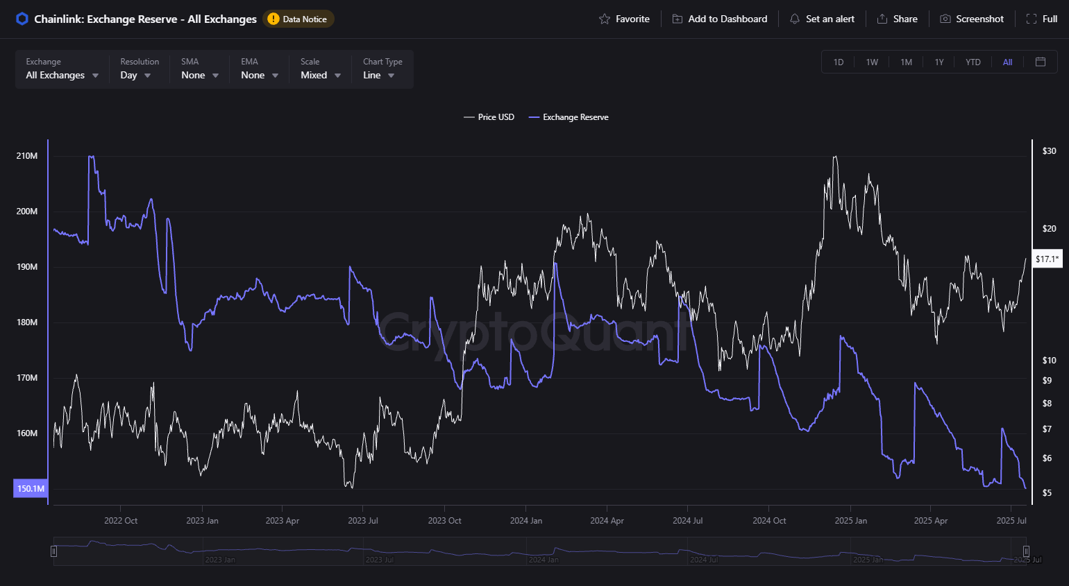 Bên cạnh yếu tố pháp lý, một yếu tố khác hỗ trợ đà tăng giá là lượng LINK trên các sàn giao dịch đã giảm xuống mức thấp kỷ lục – một tín hiệu lạc quan cho thấy niềm tin dài hạn đang gia tăng.