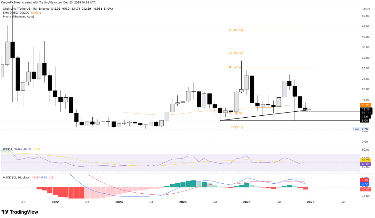 Chainlink hiện dao động quanh mốc 12 USD tại thời điểm viết bài, giảm đáng kể so với đỉnh 15,01 USD ghi nhận ngày 9/12. Việc giá bước vào tháng điều chỉnh thứ tư liên tiếp đang tạo áp lực lớn lên đường hỗ trợ dài hạn nối các đáy tháng 8/2024 và tháng 4/2025, khu vực hiện trùng với Điểm Pivot S1 quanh 10,94 USD.