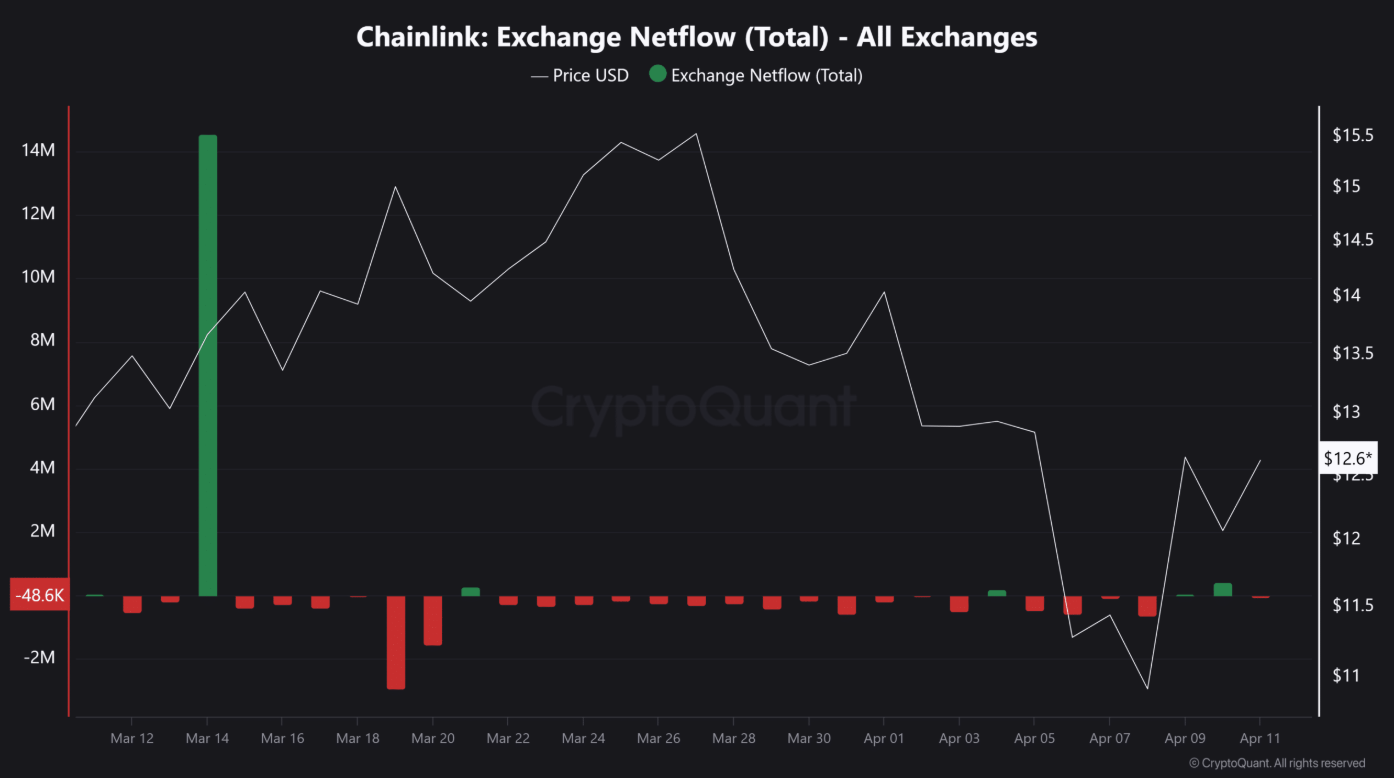 Theo thống kê từ CryptoQuant, lượng LINK nạp ròng lên các sàn giao dịch đang ở mức cao hơn một chút so với mức trung bình 7 ngày — một tín hiệu thường cho thấy áp lực bán đang âm thầm gia tăng.
