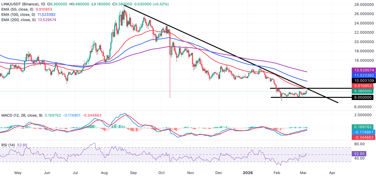 Tuy nhiên, bất chấp bầu không khí bất ổn do chiến sự leo thang, thị trường tiền điện tử vẫn cho thấy khả năng chống chịu nhất định. Chainlink tiếp tục giữ vững trên ngưỡng hỗ trợ quan trọng 9,00 USD, phản ánh lực cầu vẫn duy trì ổn định. Dẫu vậy, token oracle này đang đối mặt với áp lực kháng cự đáng kể quanh mốc 10,00 USD, khiến giá nhiều khả năng tiếp tục dao động trong biên độ hẹp, với vùng hỗ trợ gần 8,00 USD và vùng kháng cự ở 10,00 USD.