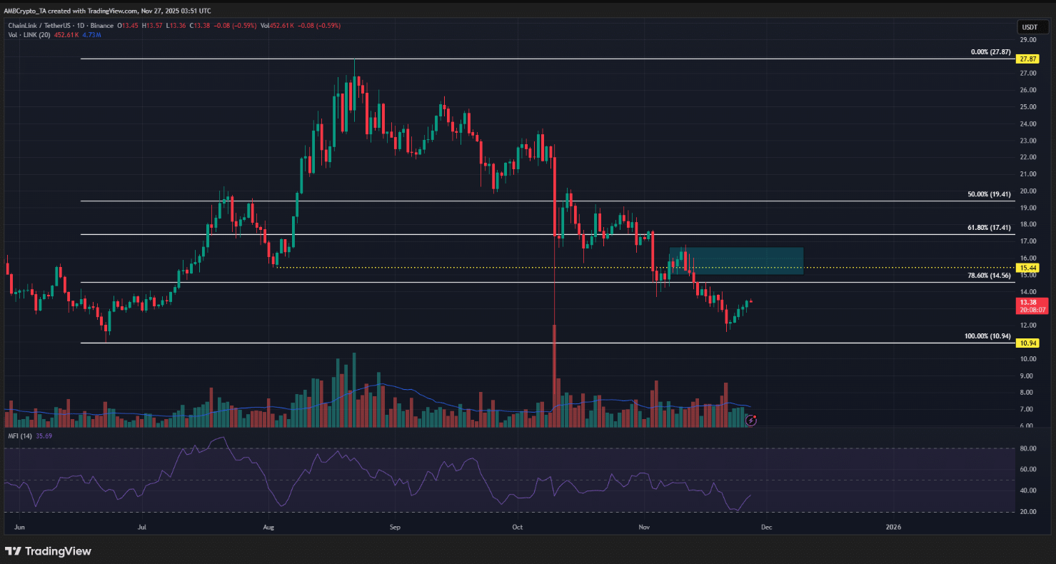 Tuy nhiên, ở chiều ngược lại, chỉ số thay đổi vị thế ròng của các hodler LINK vẫn đang nằm sâu trong vùng âm. Chỉ báo này phản ánh biến động hàng tháng của nhóm nhà đầu tư dài hạn. Giá trị âm cho thấy các hodler vẫn đang chốt lời. Xu hướng này đã xuất hiện từ tuần đầu tiên của tháng 10, trùng với thời điểm LINK bước vào nhịp điều chỉnh. Dù áp lực bán hiện đã phần nào suy yếu, dữ liệu vẫn cho thấy dòng vốn rút ra khỏi thị trường ở mức đáng kể.