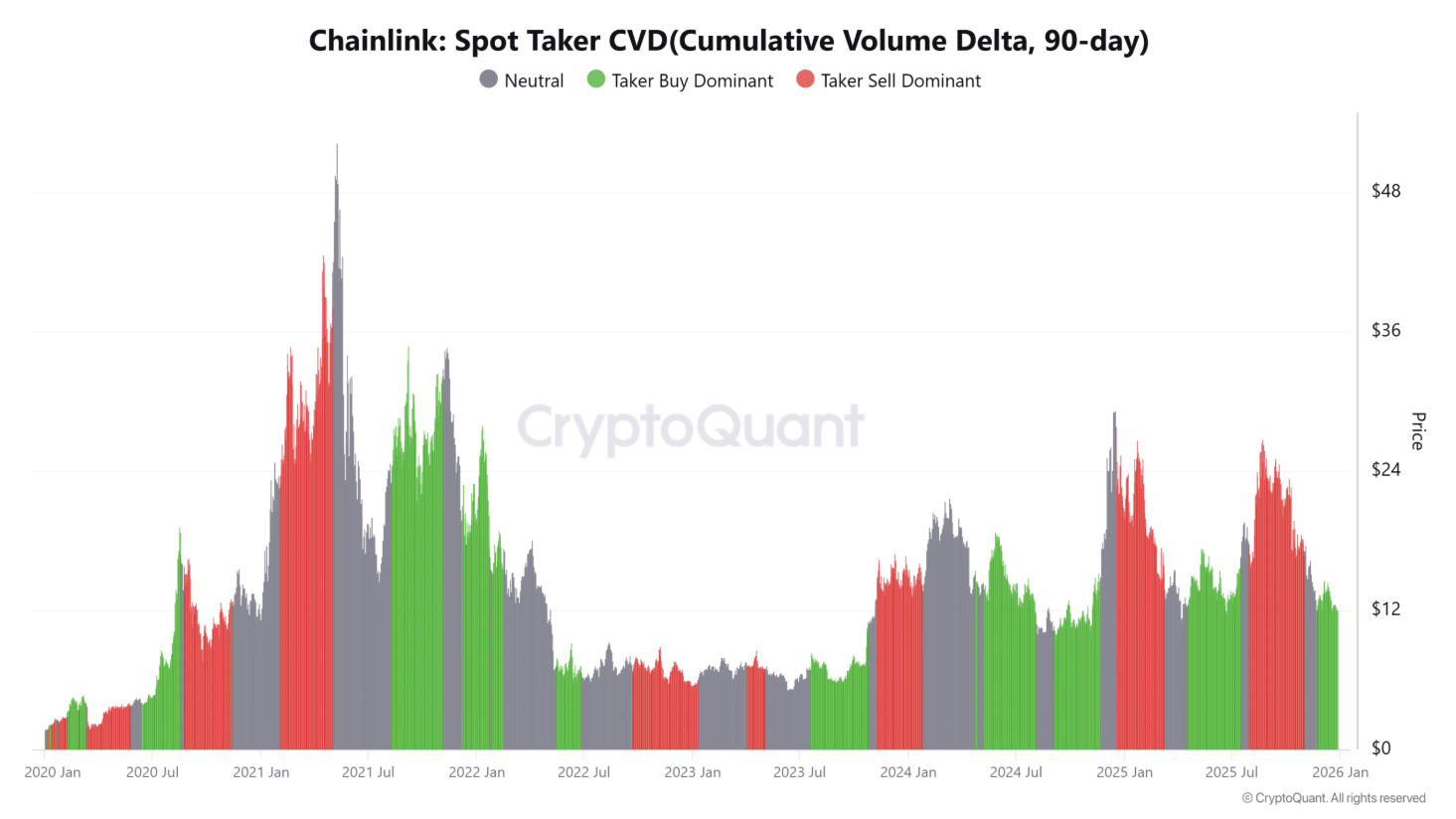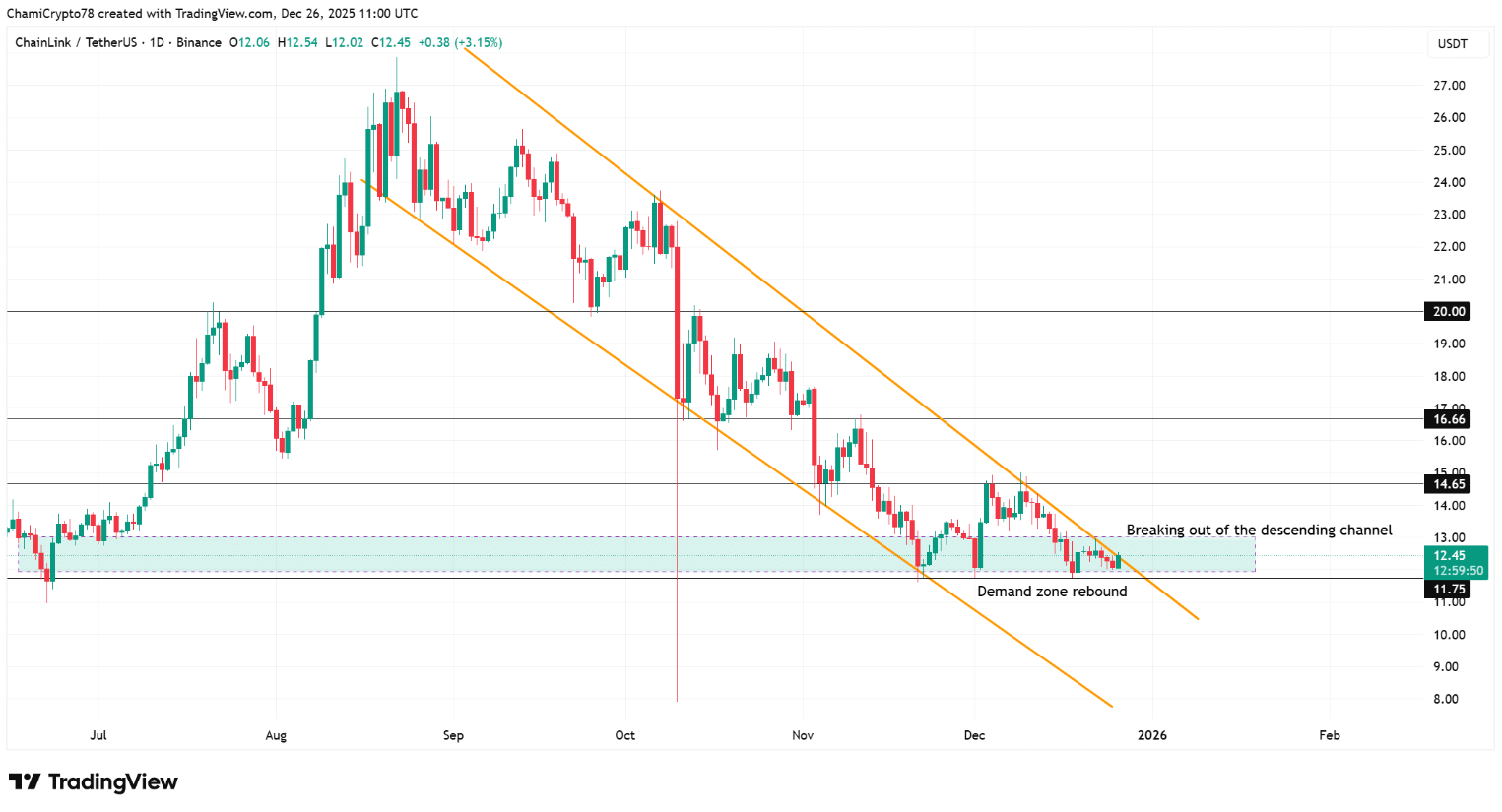 Trước đó, Chainlink di chuyển trong một vùng cầu quan trọng, nơi lực mua liên tục xuất hiện nhằm bảo vệ cấu trúc giá. Chính vùng hỗ trợ này đã chặn đứng đà suy yếu trên diện rộng, buộc giá phải bước vào giai đoạn tích lũy và ổn định trở lại.