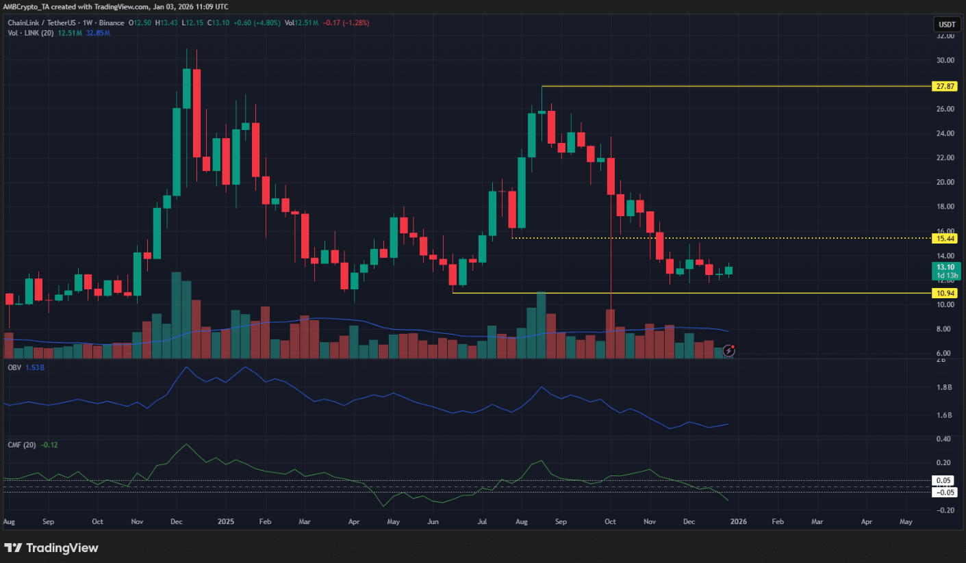Đối với LINK, cấu trúc dao động trên khung thời gian tuần vẫn mang tính tăng giá, được củng cố bởi nhịp tăng mạnh từ tháng 6 đến tháng 8 năm 2025. Tuy vậy, cấu trúc nội tại trong cùng khung thời gian lại cho thấy xu hướng giảm, trong khi các tín hiệu từ khối lượng tiếp tục phản ánh ưu thế của phe gấu.