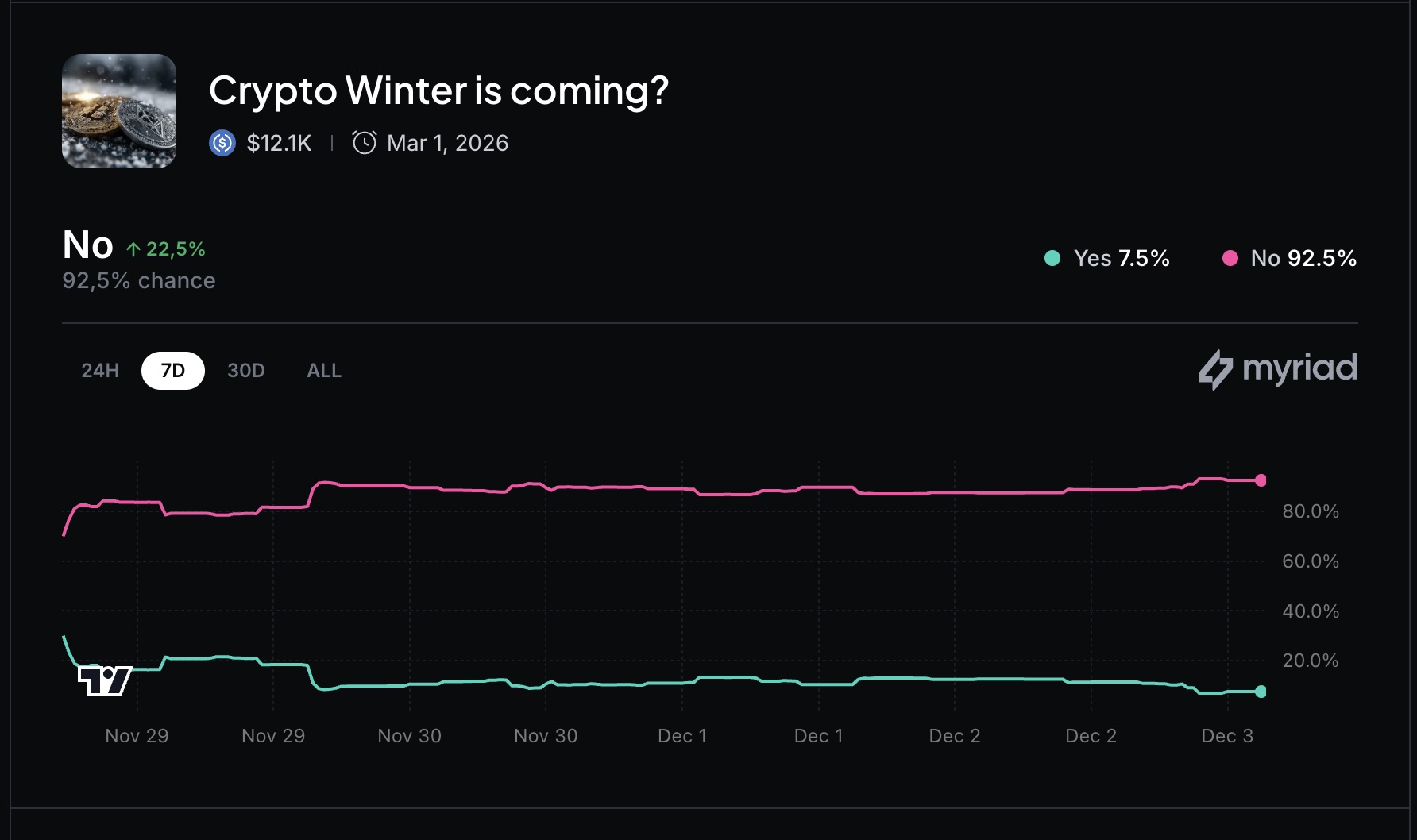 Người dùng nền tảng dự đoán Myriad đánh giá chỉ 7,5% khả năng thị trường sẽ bước vào giai đoạn “crypto winter” (mùa đông crypto). Con số này đã giảm mạnh so với 30% khi thị trường vừa ra mắt vào thứ Sáu tuần trước, trong bối cảnh Bitcoin chủ yếu dao động quanh mức 85.000 USD – gần với mức thấp 6 tháng.