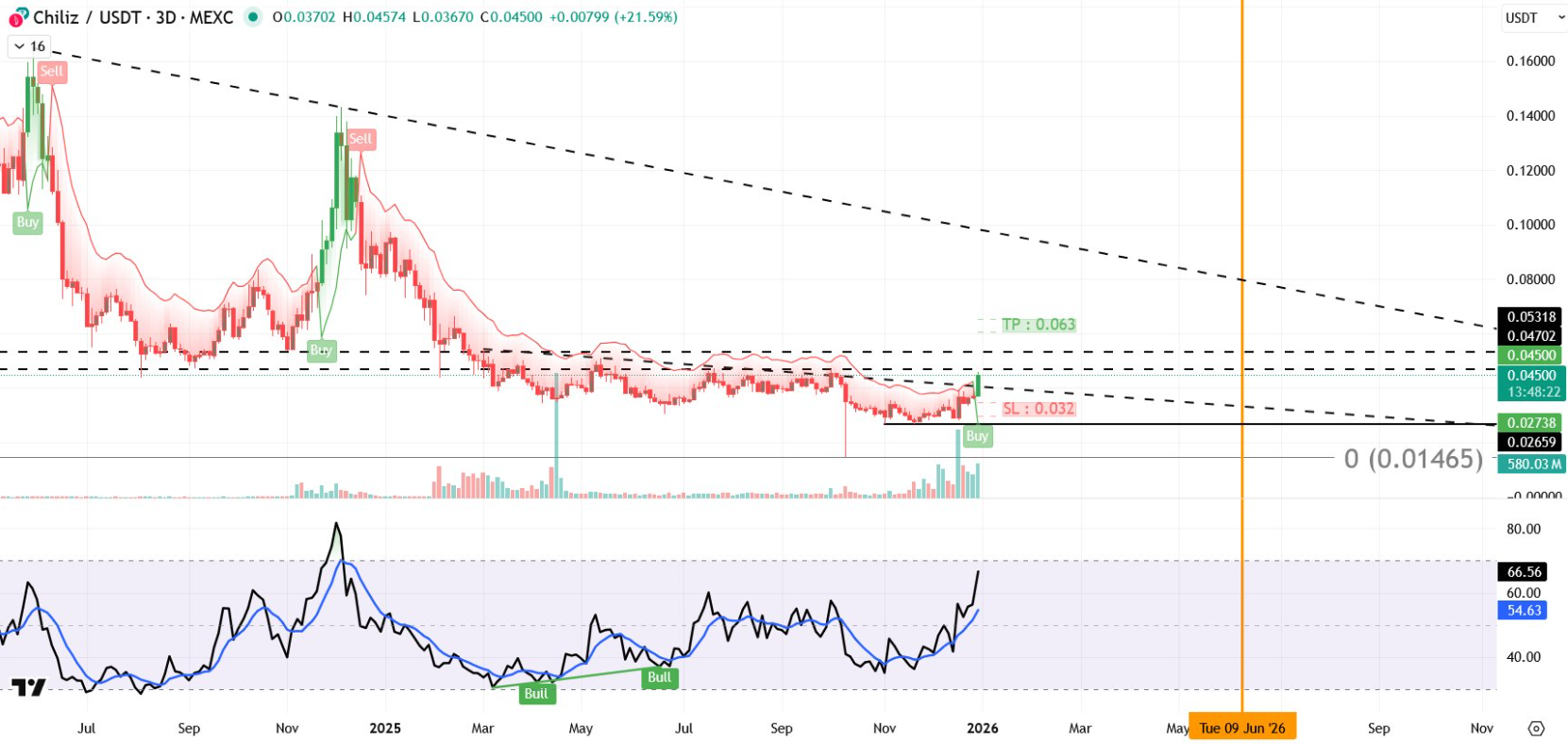Trong ngắn hạn, khi giá token Chiliz tiến sát khu vực $0,05, trader có thể theo dõi các tín hiệu đảo chiều giảm để tìm kiếm cơ hội giao dịch. Dẫu vậy, việc mở vị thế bán (Short) không phải không có rủi ro, bởi kịch bản giá đi ngang tích lũy ngay bên dưới vùng kháng cự vẫn hoàn toàn có khả năng xảy ra.