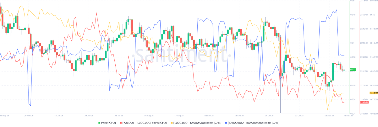 Dữ liệu Phân phối Nguồn cung từ Santiment đang củng cố triển vọng tiêu cực cho CHZ khi các “cá voi” – những người nắm giữ lượng token lớn – liên tục giảm lượng nắm giữ của họ.