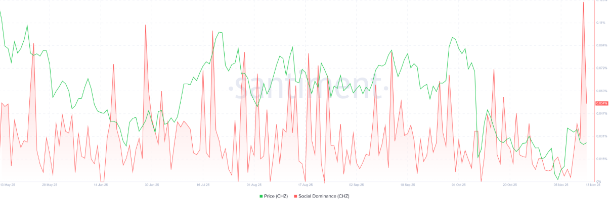Bên cạnh đó, chỉ số Social Dominance của Santiment dành cho CHZ cũng đang đi xuống. Chỉ số này đo lường tỷ lệ thảo luận về CHZ trên các nền tảng truyền thông tiền điện tử và đã giảm mạnh từ 0,124% vào thứ Tư xuống chỉ còn 0,054% vào thứ Năm, phản ánh sự quan tâm của nhà đầu tư suy yếu và mức độ tương tác cộng đồng giảm sút. Điều này cho thấy thị trường đang dần rời xa token giữa bối cảnh áp lực bán ngày càng gia tăng.