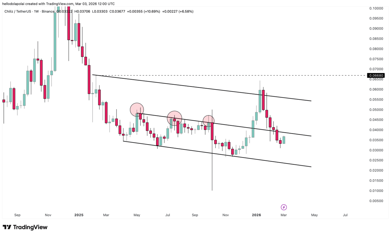 Trên khung thời gian tuần, bức tranh kỹ thuật trở nên rõ nét và có chiều sâu hơn. Tại thời điểm viết bài, CHZ vẫn đang vận động trong một kênh giảm dần – cấu trúc thường được xem là tiền đề cho khả năng đảo chiều theo hướng tích cực nếu xuất hiện tín hiệu xác nhận.