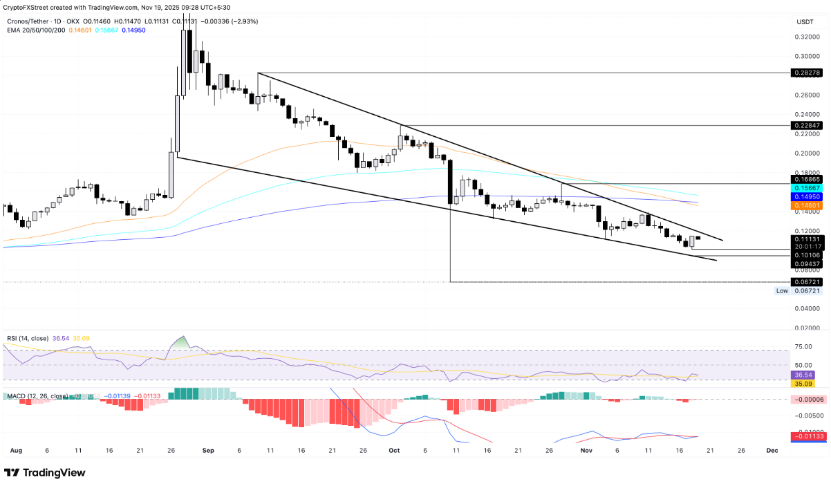 Cronos hiện đang tiến sát đỉnh mô hình cái nêm giảm — một cấu trúc giá hình thành khi lực bán suy yếu dần khiến biên độ dao động co hẹp giữa hai đường xu hướng đi xuống trên biểu đồ ngày. Trong phân tích kỹ thuật, mô hình cái nêm giảm thường là tín hiệu cho thấy giá có thể bật tăng trở lại khi phe gấu mất dần ưu thế.