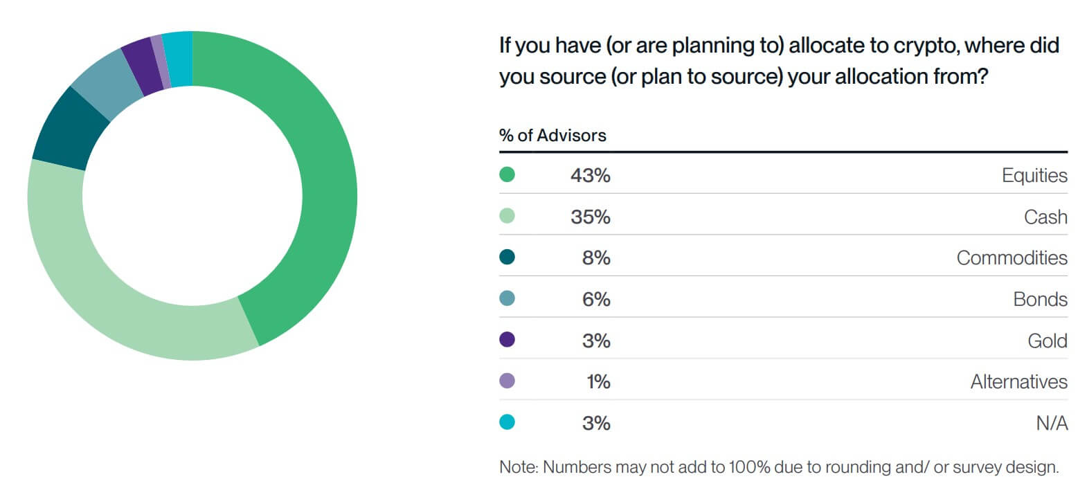 Khảo sát Bitwise/VettaFi cho thấy khi phân bổ crypto, 43% cố vấn lấy vốn từ cổ phiếu và 35% từ tiền mặt. Điều này cho thấy crypto đang được xem là một phân bổ tăng trưởng, có hồ sơ rủi ro tương đồng cổ phiếu, thay vì một khoản đầu cơ ngắn hạn.
