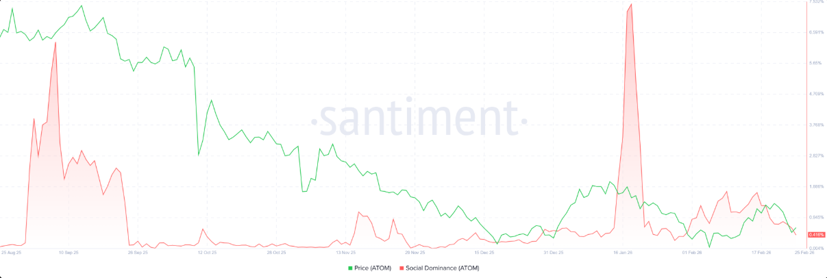 Dữ liệu Social Dominance của Cosmos Hub do Santiment cung cấp đang nghiêng rõ về kịch bản tiêu cực. Chỉ số này phản ánh tỷ trọng các cuộc thảo luận xoay quanh ATOM trên truyền thông tiền điện tử. Từ giữa tháng 1 đến nay, Social Dominance liên tục suy giảm và đà đi xuống vẫn kéo dài sang tháng 2, rơi về mức chỉ 0,416% vào thứ Tư. Xu hướng này cho thấy sự quan tâm của thị trường đang nguội dần, đồng thời tâm lý của nhà đầu tư ATOM ngày càng kém tích cực.