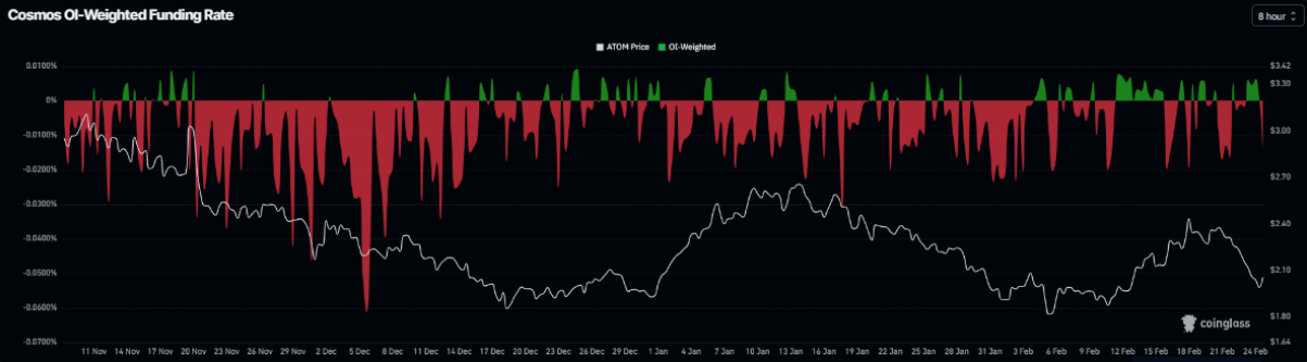Trên thị trường phái sinh, bức tranh cũng không mấy sáng sủa khi tỷ lệ funding rate của ATOM tiếp tục duy trì ở vùng âm — một tín hiệu điển hình của tâm lý bi quan. Chỉ số này chuyển sang âm vào thứ Tư, đạt -0,0147%, tiến sát mức ghi nhận hôm Chủ nhật, ngay trước thời điểm ATOM lao dốc mạnh vào ngày hôm sau. Funding rate âm đồng nghĩa phe bán (short) phải trả phí cho phe mua (long), qua đó phản ánh kỳ vọng giá giảm đối với Cosmos Hub.