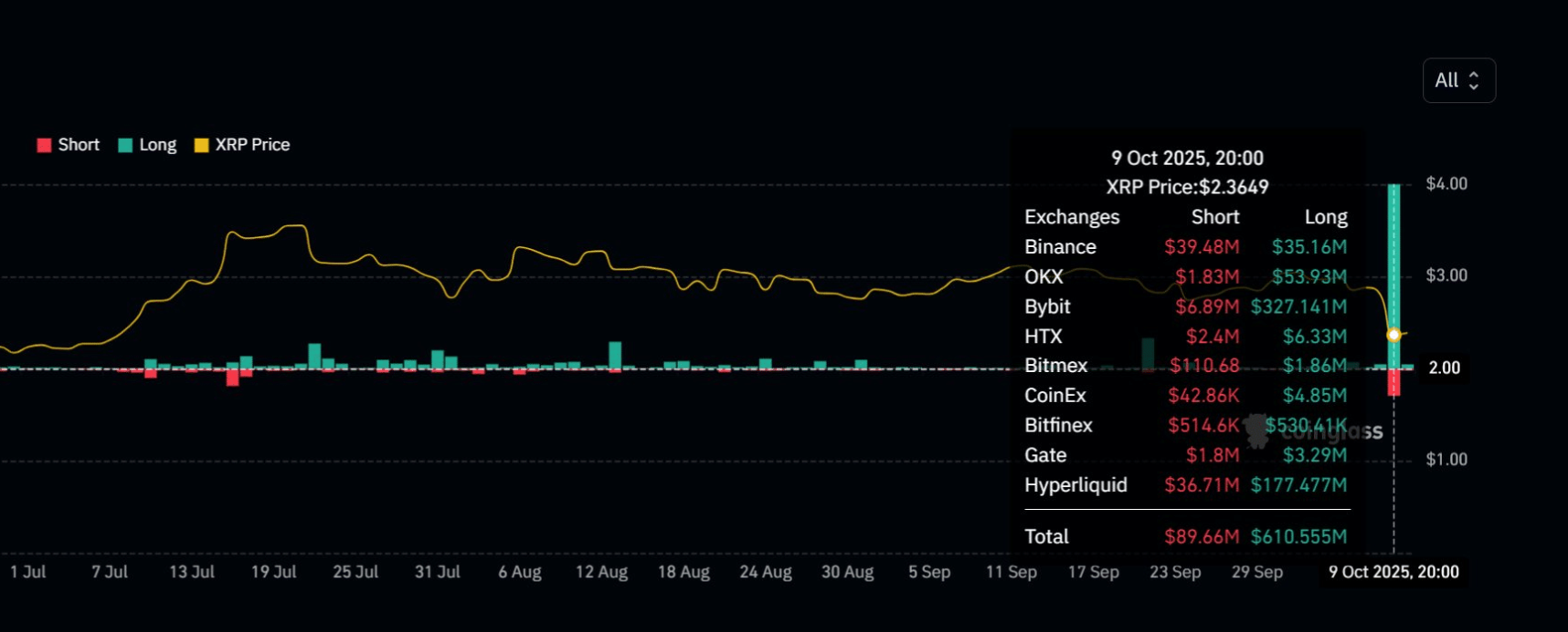 Thị trường XRP vừa trải qua một cú “rửa đòn bẩy” lịch sử vào cuối tuần qua, khi hơn 610 triệu USD vị thế Long bị quét sạch trên các sàn lớn như Binance, OKX và Bybit.