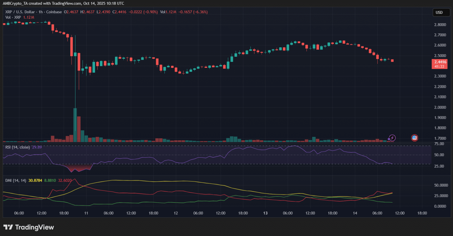 Tại thời điểm viết bài, XRP được giao dịch quanh mốc 2,44 USD, giảm hơn 6% trong 24 giờ qua khi đà phục hồi tạm thời chững lại sau làn sóng thanh lý diện rộng.