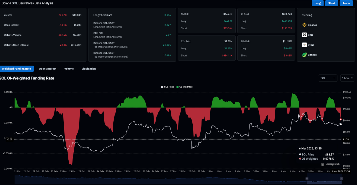 Cùng lúc đó, hợp đồng mở (OI) của hợp đồng tương lai SOL cũng suy giảm khoảng 1% trong cùng giai đoạn, còn 5,20 tỷ USD. Diễn biến này cho thấy các trader đang thu hẹp quy mô vị thế hoặc hạn chế sử dụng đòn bẩy trong bối cảnh khẩu vị rủi ro suy yếu. Bên cạnh đó, funding rate đã đảo chiều xuống -0,0078%, từ mức dương 0,0067% trước đó trong ngày thứ Sáu, phản ánh sự gia tăng rõ rệt của các vị thế bán khống trên thị trường.