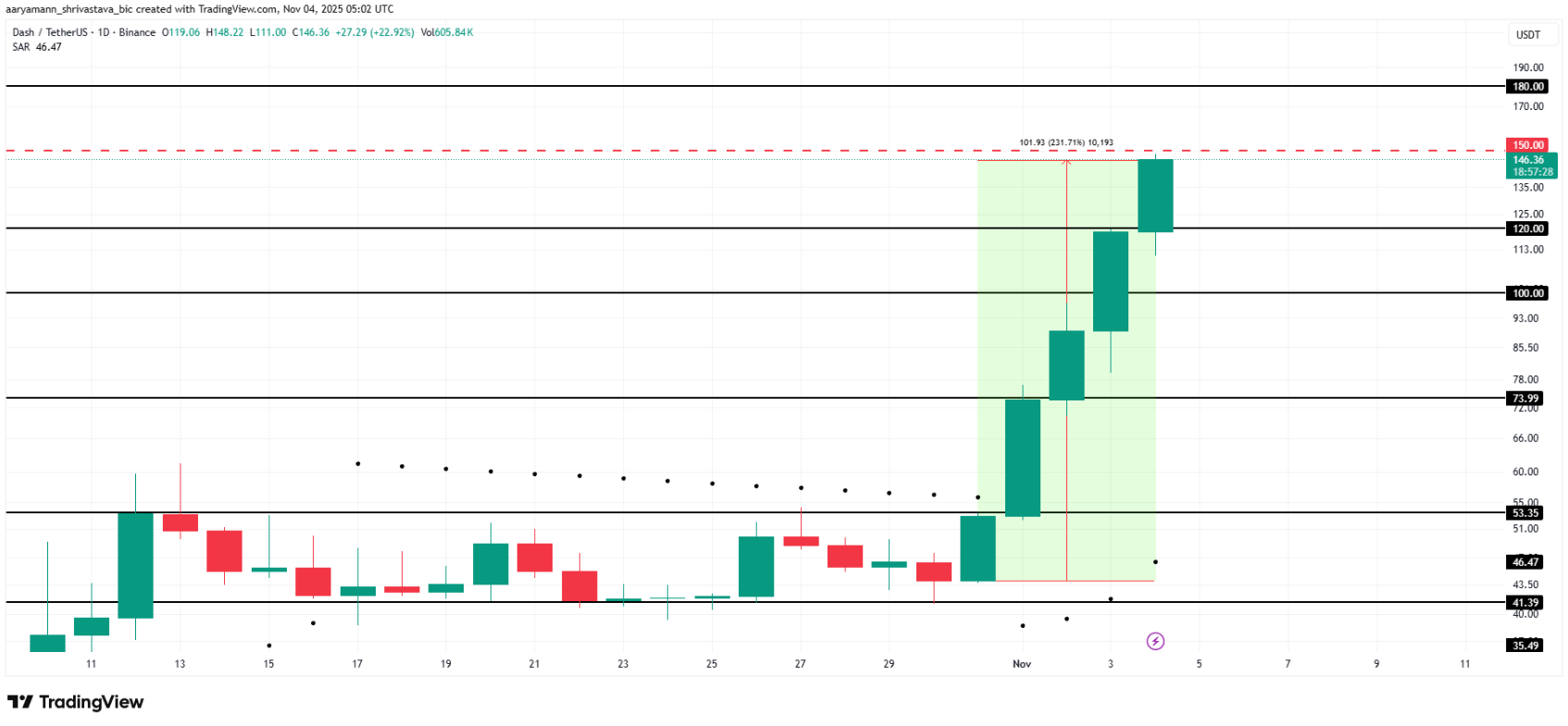 Giá Dash đã tăng vọt 231% chỉ trong 5 ngày, hiện giao dịch quanh 146 USD – mức cao nhất trong 3 năm 9 tháng và cũng là lần đầu tiên vượt mốc 100 USD kể từ tháng 4/2022. Đà tăng ấn tượng này đánh dấu sự trở lại mạnh mẽ của Dash, củng cố vị thế của nó trong nhóm tiền điện tử tập trung vào quyền riêng tư.
