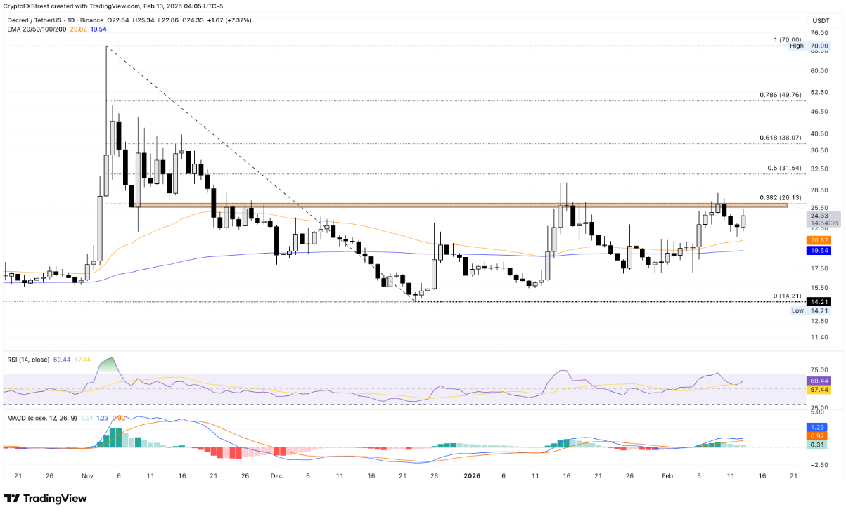 Decred (DCR) ghi nhận nhịp hồi phục hơn 7% vào thời điểm viết bài ngày thứ Sáu, sau chuỗi ba phiên điều chỉnh liên tiếp khiến giá mất gần 14%. Đà tăng này được tiếp sức đáng kể bởi khối lượng giao dịch bật tăng khoảng 60% trong 24 giờ qua, phản ánh lực cầu đang cải thiện rõ rệt trên thị trường giao ngay. Tuy nhiên, xét trên phương diện kỹ thuật, Decred vẫn đối mặt với áp lực lớn từ vùng kháng cự quanh mốc 26 USD — khu vực đã nhiều lần kìm hãm đà tăng kể từ cuối tháng 11.