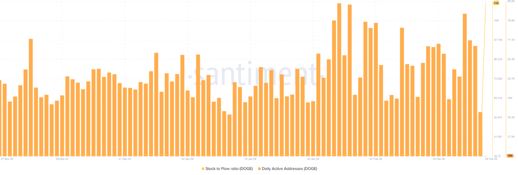 Điều này cho thấy Dogecoin đang thiếu hụt lực cầu tự nhiên đủ mạnh — yếu tố then chốt để kích hoạt bất kỳ đợt tăng giá bền vững nào. Thực tế, số lượng địa chỉ hoạt động hàng ngày (Daily Active Addresses) đã sụt giảm tới 78,34%, từ 87,7 nghìn xuống chỉ còn khoảng 19 nghìn trong tháng Hai.