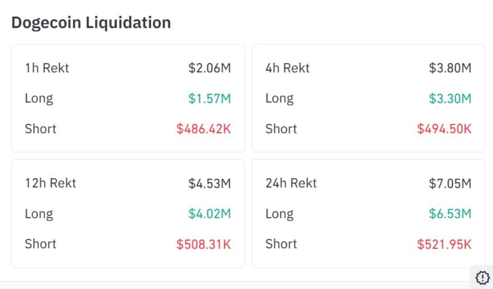 Cụ thể, Dogecoin ghi nhận tổng cộng 6,5 triệu USD các vị thế Long bị “quét sạch”, trong đó riêng 4 giờ gần nhất đã có tới 3,3 triệu USD lệnh Long bị thanh lý.