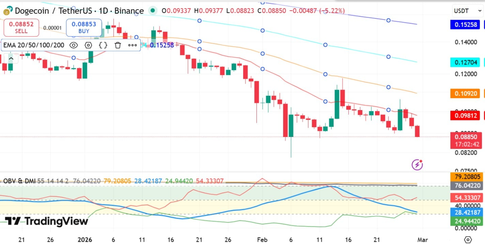 Đáng chú ý, đồng memecoin còn xuyên thủng đường EMA 20 ngày tại 0,098 USD — tín hiệu cho thấy động lượng giảm đang chiếm ưu thế rõ rệt. Tại thời điểm viết bài, DOGE giao dịch quanh 0,089 USD, mất 10,48% giá trị và tiếp tục duy trì cấu trúc xu hướng giảm.
