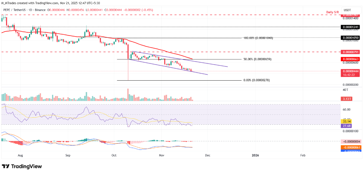 Giá Pepe bị từ chối tại biên trên của đường xu hướng vào ngày 11/11, kéo theo mức giảm hơn 31% trong vòng 10 ngày sau đó. Tính đến thời điểm viết bài hôm thứ Sáu, PEPE vẫn đang dao động sát biên dưới của đường xu hướng, cho thấy áp lực bán chưa hạ nhiệt.