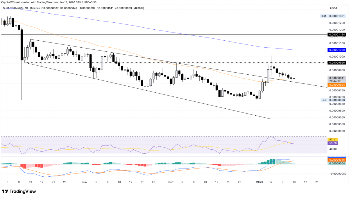 Shiba Inu đang dao động ngay phía trên đường EMA 50 ngày tại mốc 0,00000834 USD, phát đi tín hiệu cho thấy thị trường tạm thời ổn định sau chuỗi điều chỉnh kéo dài bảy phiên liên tiếp. Tại thời điểm viết bài, SHIB ghi nhận nhịp hồi phục nhẹ trong phiên thứ Ba, khi giá gần như quay lại kiểm tra vùng bứt phá của mô hình kênh giảm trước đó.