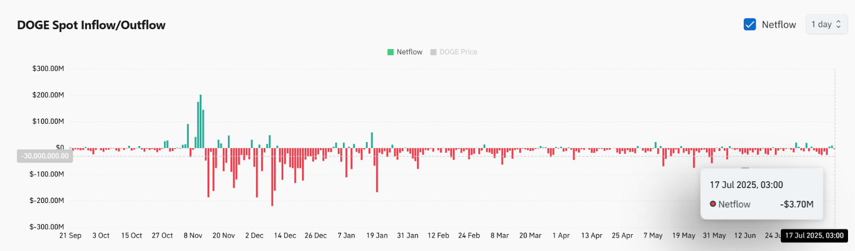 Dữ liệu on-chain cho thấy dòng tiền rút ròng khỏi các sàn giao dịch vẫn đang tiếp diễn, với tổng giá trị lên tới 3,70 triệu USD tại thời điểm viết bài. Diễn biến này không chỉ phản ánh sự suy giảm áp lực bán mà còn cho thấy niềm tin ngày càng lớn của các nhà đầu tư dài hạn vào tiềm năng của DOGE.