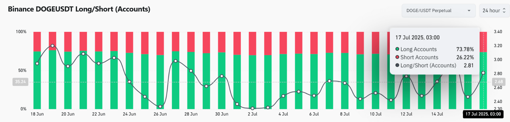 Trên thị trường DOGE/USDT tại sàn Binance, phe bò đang chiếm thế thượng phong khi có tới 73,78% trader đặt niềm tin vào xu hướng tăng giá. Tỷ lệ Long/Short vọt lên mức 2,81, phản ánh sự thiên lệch rõ rệt về phía các vị thế Long.