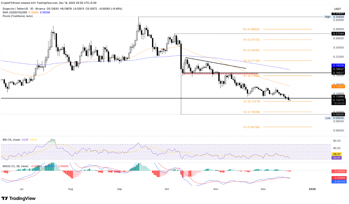 Nếu DOGE phá vỡ xuống dưới mốc 0,1231 USD, đà giảm có thể mở rộng về vùng hỗ trợ tâm lý 0,1000 USD.