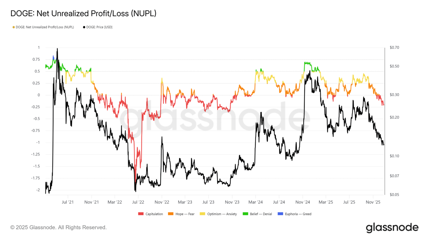 Tuy vậy, ngay cả trong kịch bản phục hồi vượt mốc 0,135 USD, nhà đầu tư vẫn cần duy trì sự thận trọng. Chỉ số Net Unrealized Profit/Loss cho thấy Dogecoin đang bước vào giai đoạn đầu của quá trình “đầu hàng”, khi áp lực tâm lý và thua lỗ chưa được giải tỏa hoàn toàn.