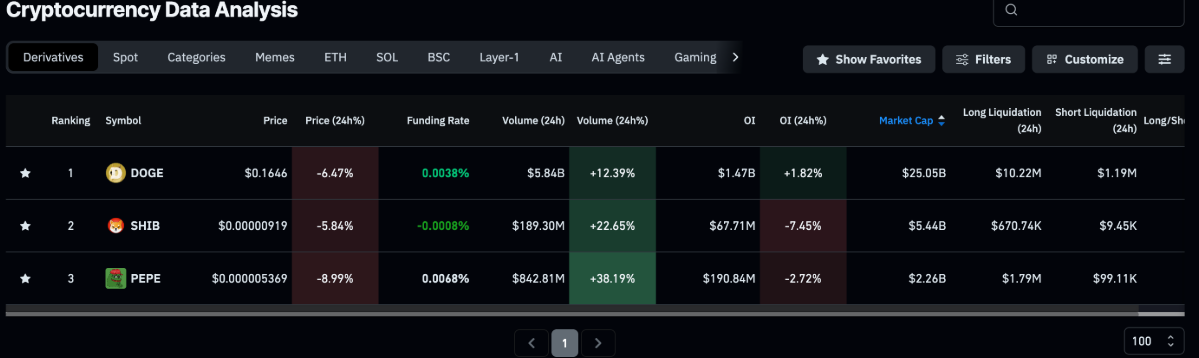 Tâm lý “ngại rủi ro” cũng lan rộng trên thị trường phái sinh. Dữ liệu từ CoinGlass cho thấy hợp đồng mở (OI) hợp đồng tương lai của SHIB và PEPE lần lượt giảm khoảng 7% và 3% trong 24 giờ qua, xuống còn 67,71 triệu USD và 190,84 triệu USD.