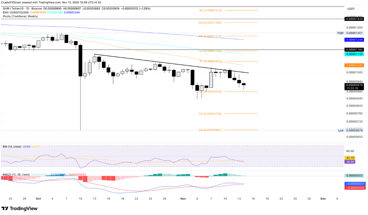 Shiba Inu tiếp tục lao dốc dưới ngưỡng tâm lý 0,00001000 USD, chốt phiên bằng cây nến đỏ thứ tư liên tiếp trên khung ngày. Đà giảm hiện đang kéo SHIB tiến sát vùng Pivot Point S1 tại 0,00000879 USD – khu vực từng đóng vai trò hỗ trợ trong nhịp phục hồi tuần trước.
