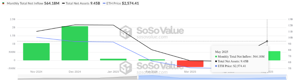 Theo dữ liệu từ SosoValue, các quỹ Ethereum ETF giao ngay đã ghi nhận tổng dòng tiền chảy vào là 564,18 triệu USD trong tháng 5, mức cao nhất trong năm nay.
