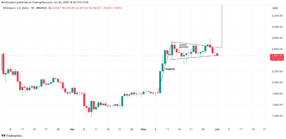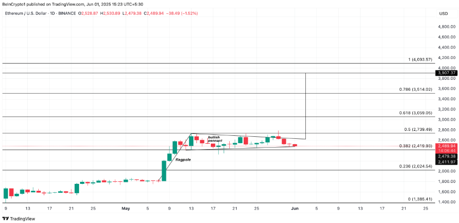 ETH hiện đang giao dịch quanh $2.529, nằm trên đường dưới của cờ hiệu, tạo thành hỗ trợ ở mức $2.479. Nếu xảy ra breakout tăng giá, ETH có thể tăng thêm khoảng 49% để giao dịch quanh $3.907.