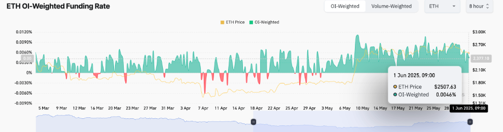 Hơn nữa, theo dữ liệu từ Coinglass, funding rate của ETH tiếp tục ghi nhận các giá trị trên 0, cho thấy sự ưu tiên cho các vị thế Long ngay cả trong giai đoạn củng cố đang diễn ra. Tính đến thời điểm hiện tại, funding rate của ETH là 0,0046%.
