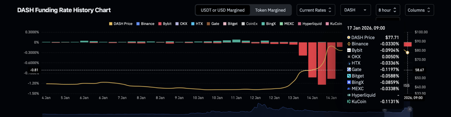 Đối với DASH, sự sụt giảm đồng thời của hợp đồng mở và Funding rate cho thấy xu hướng dịch chuyển rõ rệt sang các vị thế bán. Funding rate chuyển sang vùng âm, ở mức -0,0356%, phản ánh việc các trader bán khống sẵn sàng chịu chi phí cao hơn để duy trì vị thế, khi kỳ vọng giá tiếp tục chịu áp lực trong ngắn hạn.