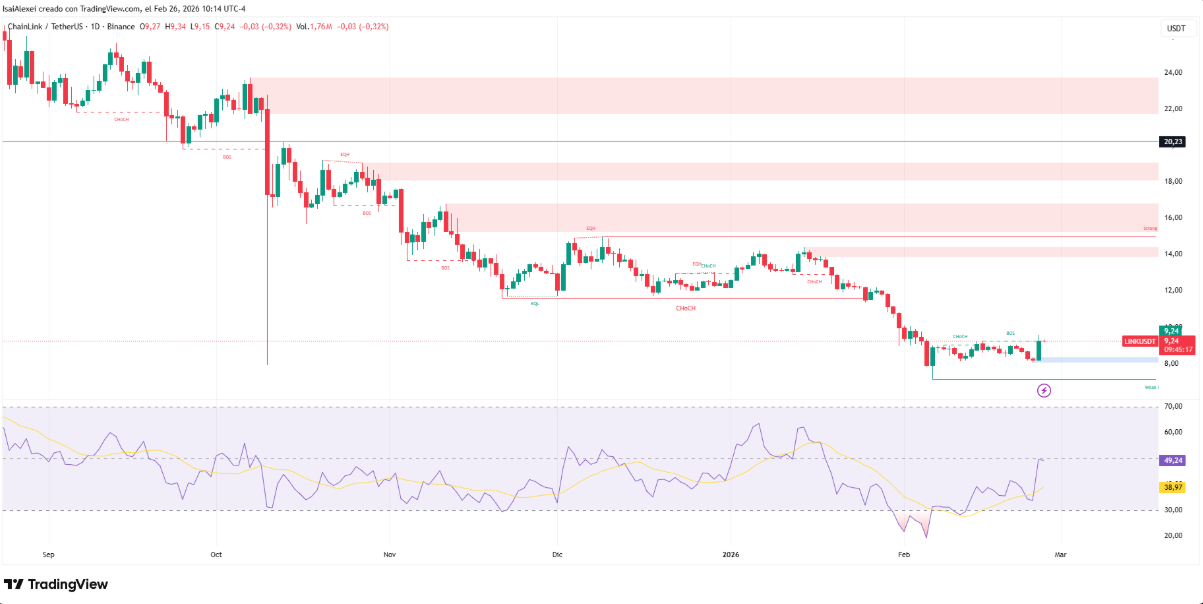 LINK ghi nhận mức đáy 8,20 USD vào rạng sáng thứ Ba (giờ UTC). Chỉ chưa đầy 24 giờ sau, giá đã bật tăng lên 9,35 USD, chạm đỉnh trong ngày tại 9,50 USD trước khi hạ nhiệt và ổn định quanh mốc 9,25 USD. Mức tăng khoảng 14% trong thời gian ngắn này đã đưa LINK quay trở lại vùng giá cao nhất kể từ ngày 5/2 — một diễn biến càng đáng chú ý khi phần lớn các altcoin khác đang tiếp tục suy yếu, và gần như đi ngang trong bối cảnh thị trường chung thiếu động lực.
