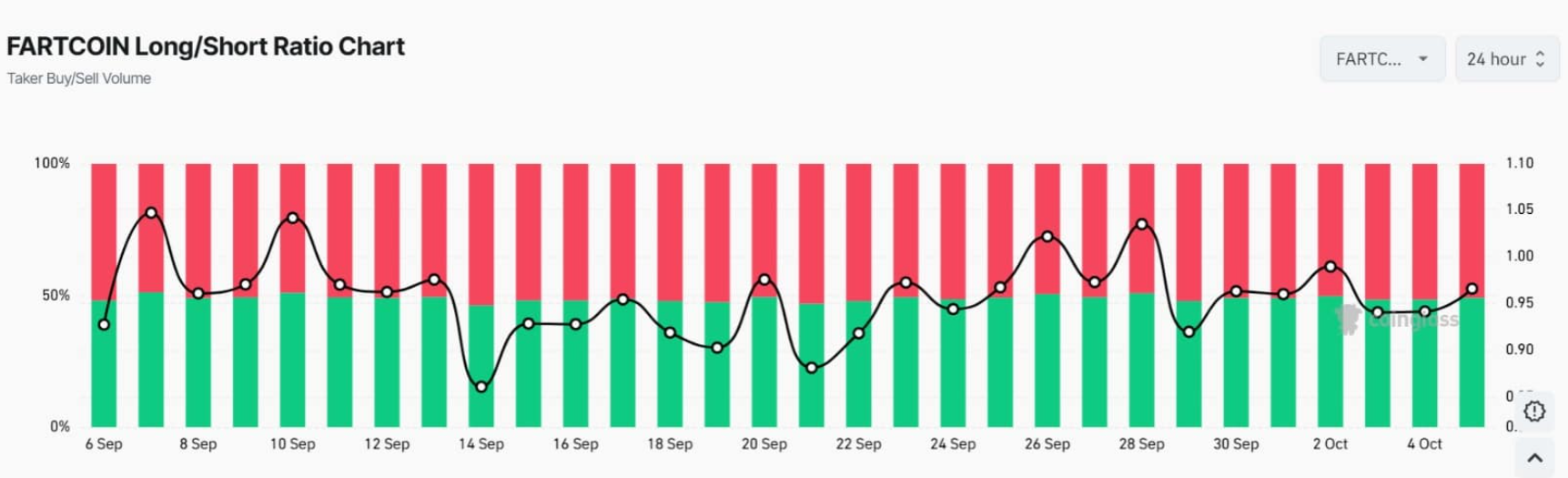 Tuy nhiên, tỷ lệ Long/Short của Fartcoin lại giảm xuống dưới mốc 1, còn 0,97, dù trên sàn OKX, chỉ số này bật tăng lên 2,82. Khi tỷ lệ này xuống dưới 1, điều đó phản ánh phần lớn nhà đầu tư đang nghiêng về phía bán ra.