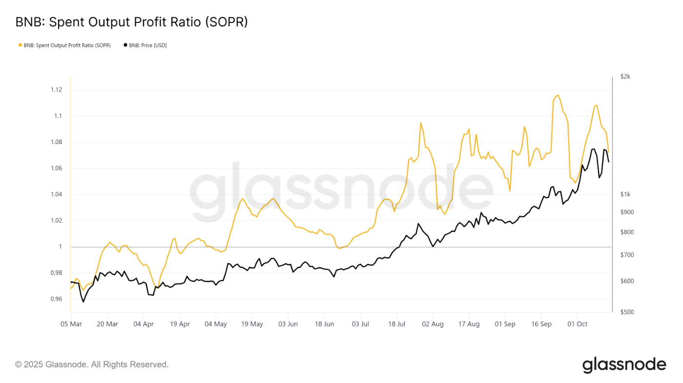 Chỉ số Spent Output Profit Ratio (SOPR) đang bắt đầu hé lộ những dấu hiệu cho thấy lợi nhuận của nhà đầu tư BNB đang giảm dần. Các số liệu gần đây dao động quanh mức trung lập 1,0, ám chỉ rằng các nhà đầu tư chỉ thu về lợi nhuận tối thiểu. Mặc dù điều này chưa đồng nghĩa với thua lỗ, nhưng rõ ràng biên lợi nhuận của BNB đang co hẹp.