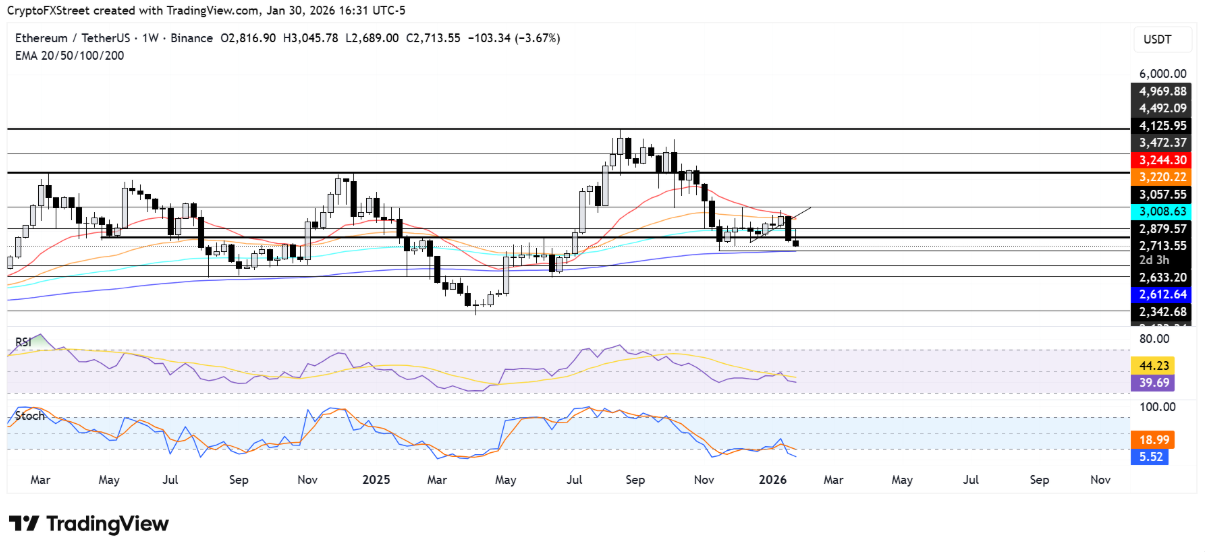 Sau khi thất bại trong nỗ lực chinh phục ngưỡng kháng cự 3.060 USD, ETH đang dần lùi về vùng hỗ trợ then chốt quanh 2.630 USD, khu vực nằm sát đường trung bình động hàm mũ (EMA) 100 tuần. Đáng chú ý, mốc 2.630 USD còn được củng cố bởi EMA 200 tuần — ngưỡng hỗ trợ mà phe bò từng bảo vệ thành công trong các đợt điều chỉnh vào tháng 6 và tháng 11 năm ngoái.