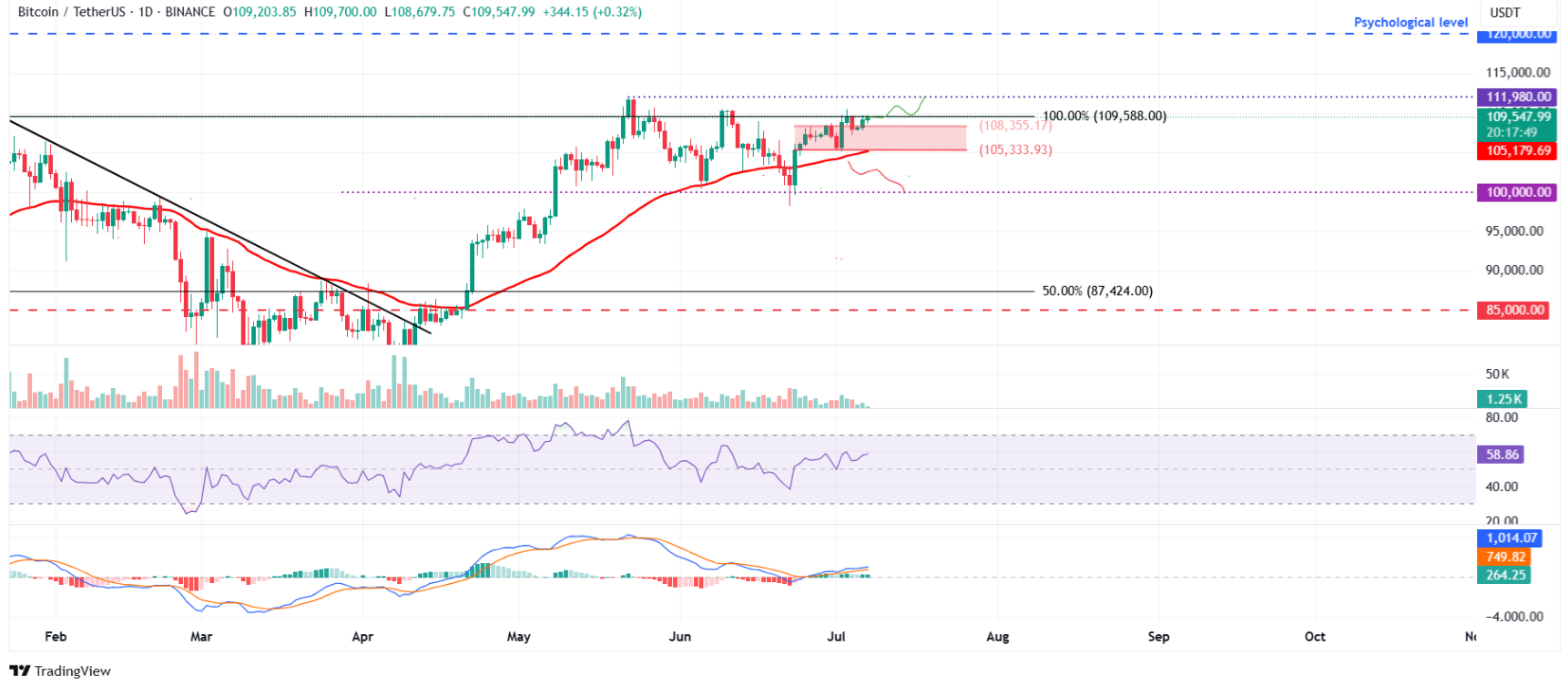 Nếu xu hướng tăng hiện tại tiếp tục được duy trì, BTC hoàn toàn có thể mở rộng đà tăng, hướng đến mốc đỉnh lịch sử $111.980 từng được thiết lập vào ngày 22/5.