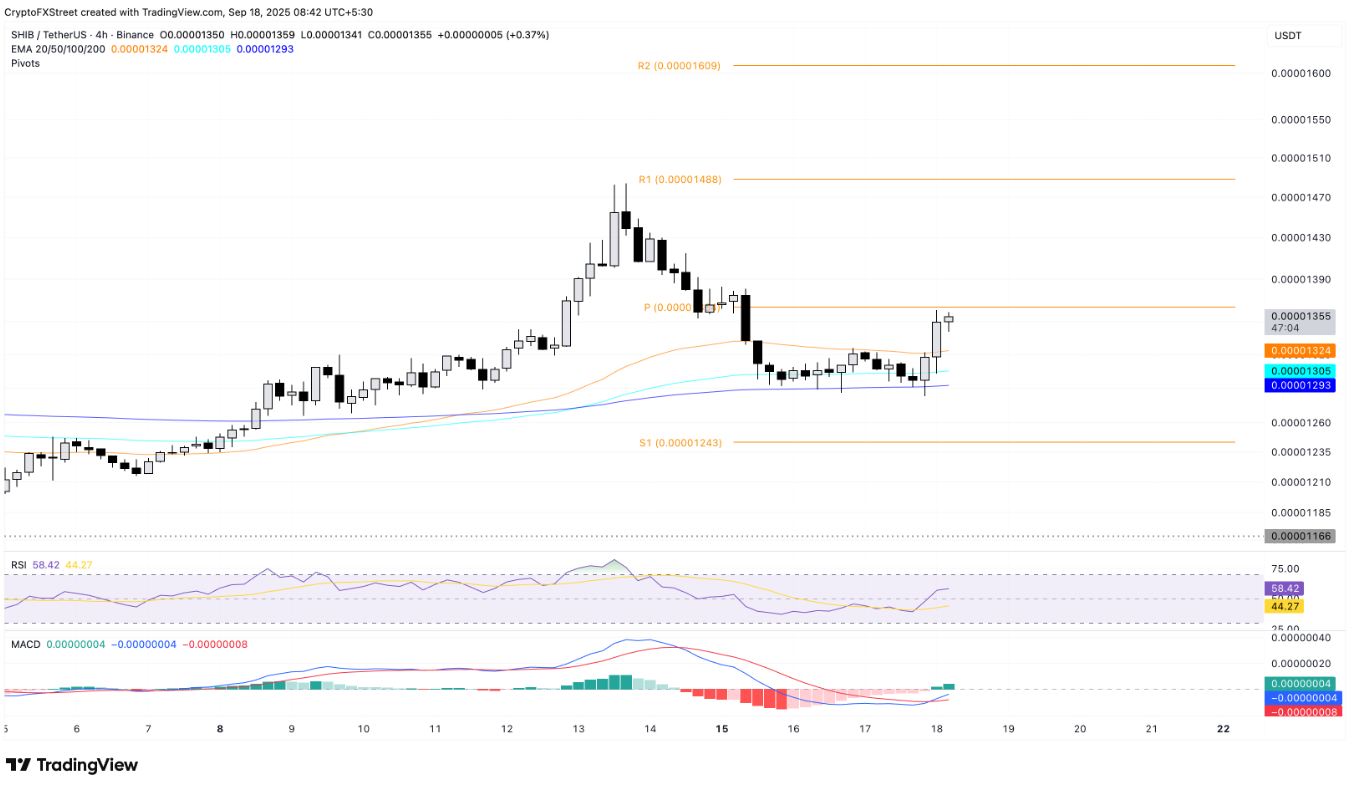 Shiba Inu ghi nhận mức tăng nhẹ gần 0,50% vào thời điểm viết bài ngày thứ Năm, nối dài chuỗi 3 phiên tăng liên tiếp. Trên khung 4 giờ, SHIB đã bật trở lại từ đường EMA 200 kỳ và hiện đang thách thức vùng trục xoay trung tâm tại 0,00001364 USD.