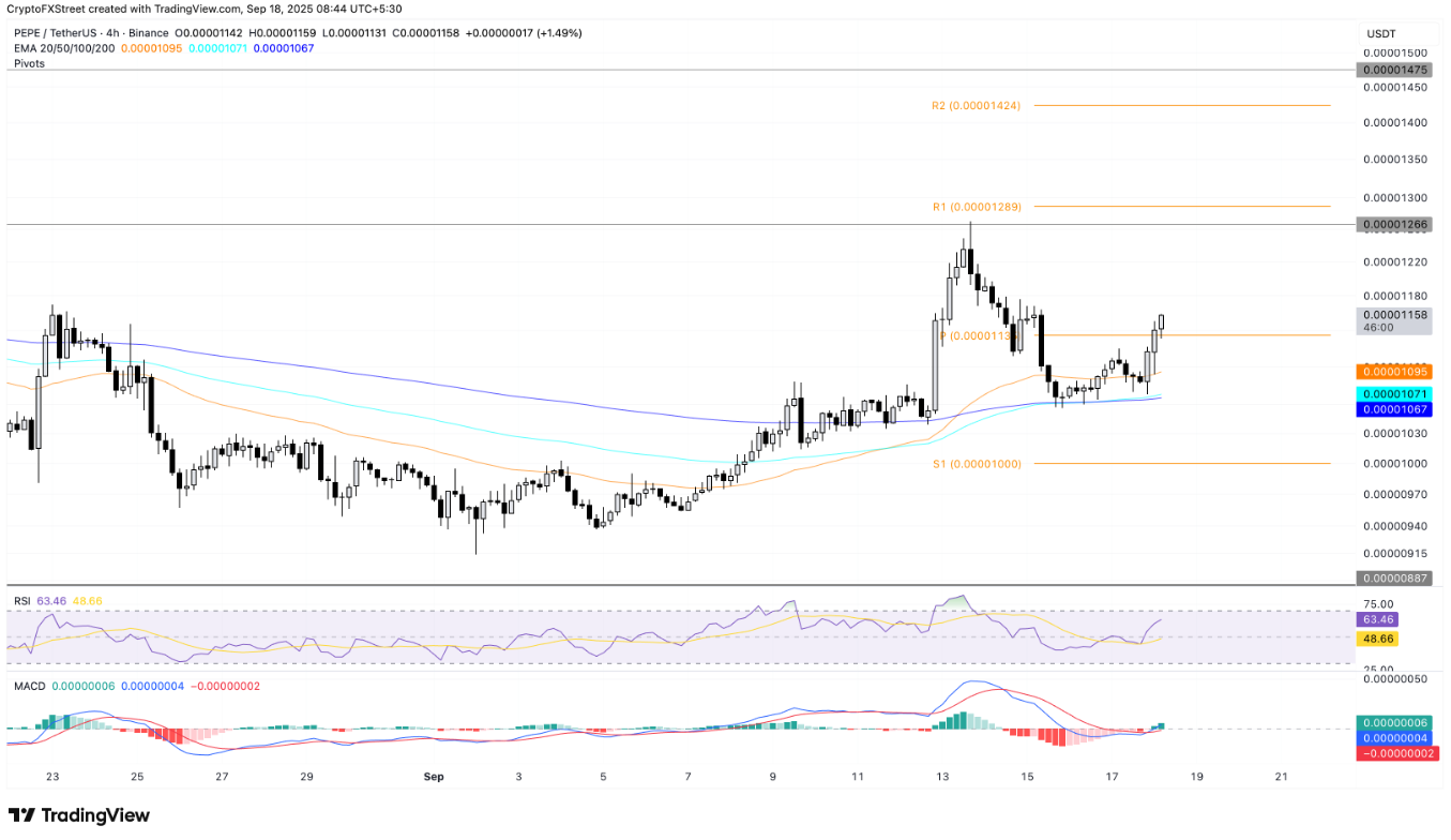 Pepe tăng hơn 1% vào phiên giao dịch thứ Năm, tiếp tục nhịp hồi phục từ đường EMA 200 kỳ trên khung 4 giờ. Đà bứt phá đã vượt qua ngưỡng trục xoay trung tâm tại 0,00001135 USD và đang hướng đến mốc 0,00001266 USD – vùng kháng cự từng được kiểm tra vào cuối tuần trước.