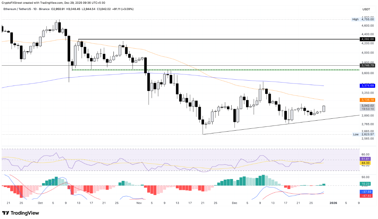 Nếu bứt phá thành công lên trên đường EMA này, đà tăng của Ethereum nhiều khả năng sẽ được mở rộng, với mục tiêu tiếp theo là đường EMA 200 ngày tại 3.374 USD, tương đương mức tăng khoảng 11% so với vùng giá hiện tại.