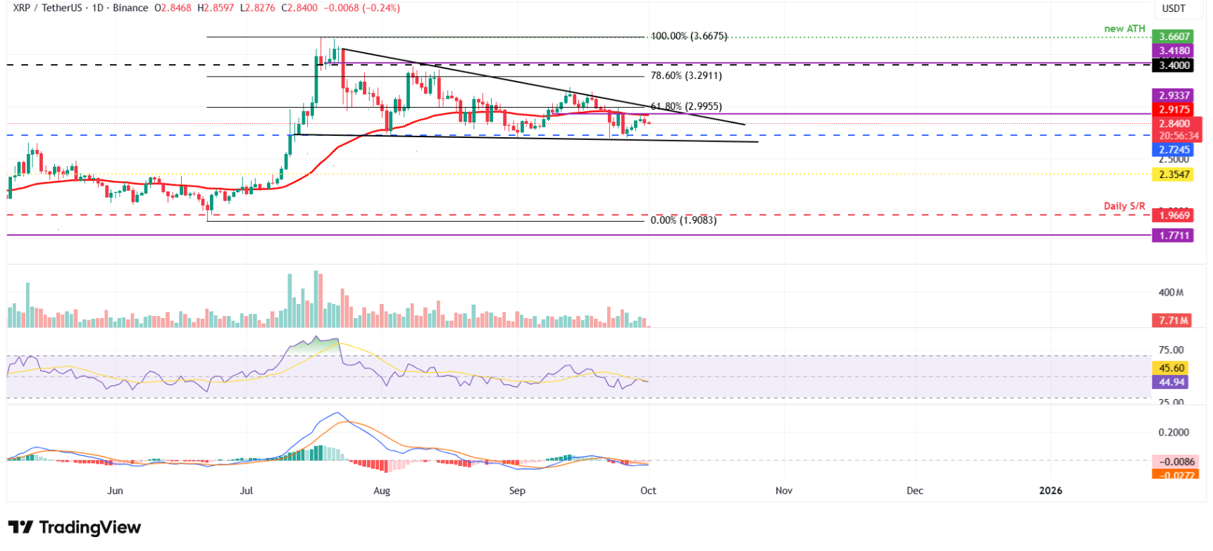XRP đã tìm được điểm tựa quanh vùng hỗ trợ 2,72 USD vào thứ Sáu, trước khi bật tăng gần 5% tính đến đầu tuần. Tuy nhiên, đà đi lên nhanh chóng bị chặn lại khi giá chạm đường EMA 50 ngày tại 2,91 USD vào hôm sau, kéo theo mức giảm 1,16%. Tính đến trưa thứ Tư, XRP đang dao động quanh mốc 2,84 USD.