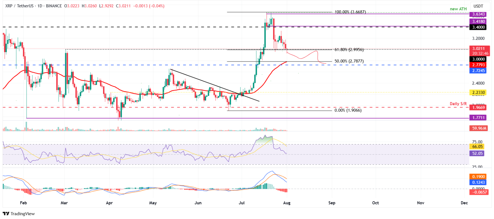 Giá XRP đã xuyên thủng ngưỡng hỗ trợ khung ngày tại $3,40 vào ngày 23/7, lao dốc 11% chỉ trong vòng 24 giờ sau đó. Tuy nhiên, đến thứ Sáu, đà giảm tạm thời chững lại khi XRP kiểm tra thành công vùng hỗ trợ quanh mốc Fibonacci thoái lui 61,8% tại $2,99, rồi bật tăng nhẹ 3,43% vào cuối tuần.