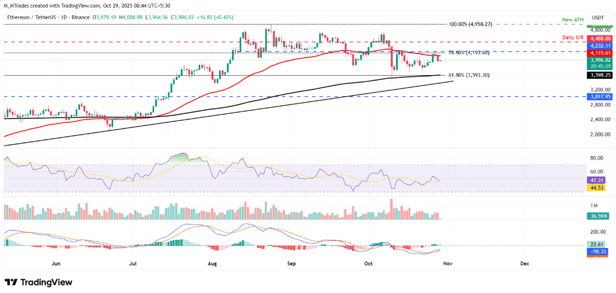 Giá Ethereum đã bị từ chối tại vùng kháng cự 4.232 USD trong phiên giao dịch ngày thứ Hai, kéo theo mức giảm 4,66% ở phiên kế tiếp. Vùng giá này gần trùng với mức Fibonacci thoái lui 78,6% tại 4.193 USD và đường EMA 50 ngày quanh 4.115 USD, hợp lưu tạo nên cụm kháng cự mạnh. Tính đến trưa thứ Tư, ETH đang dao động quanh 3.996 USD.